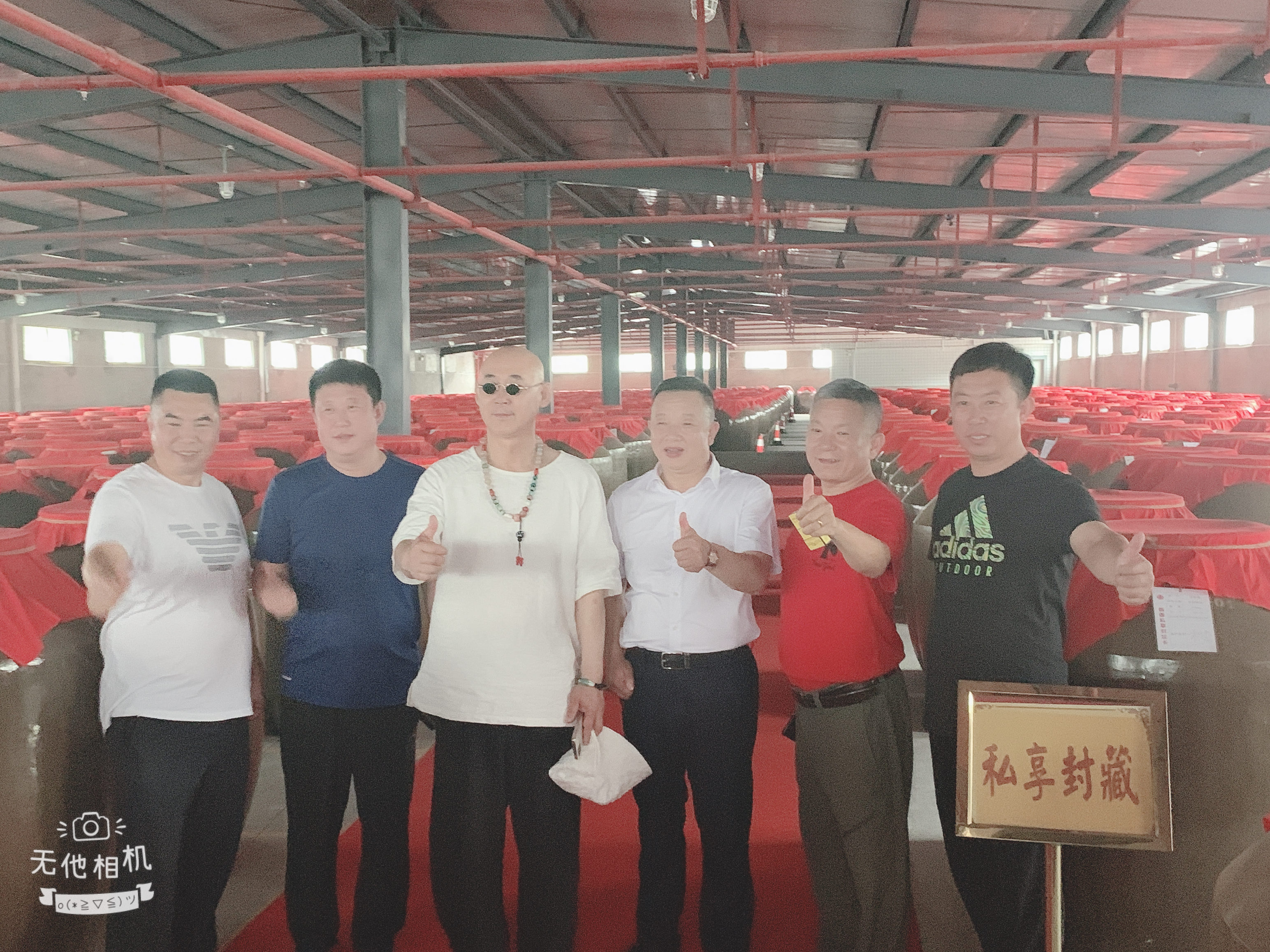 “委員長(zhǎng)”(左三)一行與公司董事長(zhǎng)(右三)在老酒儲(chǔ)存庫(kù)點(diǎn)贊合影